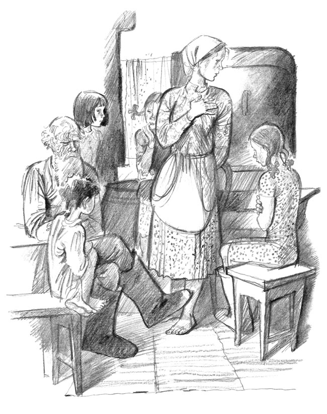 У матери разошлись сведённые брови. Ей даже стало стыдно, что она так расходилась, не узнав, в чём дело. И она была рада, что не нужно никого ругать и наказывать. Она села на лавку, отбросила хворостину и засмеялась. В это время вошёл дед.