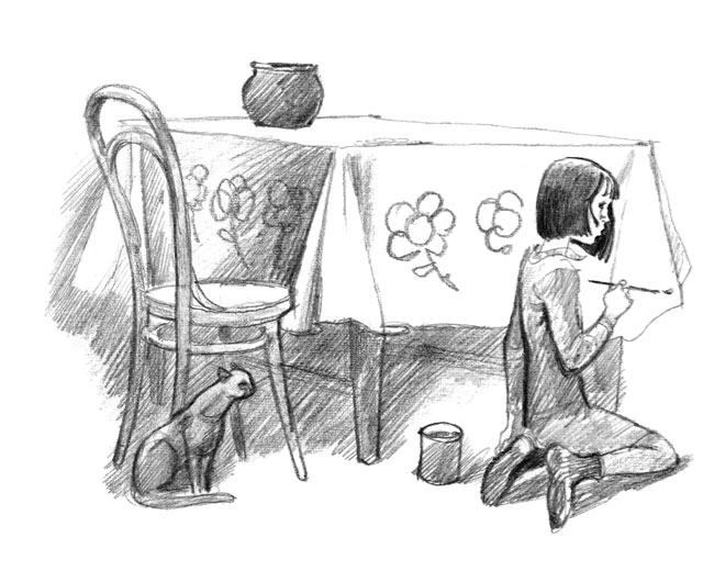 Валентинка на минутку задумалась. Можно ли рисовать цветы на скатерти? Её мама, наверно, сказала бы, что нельзя. Но там было нельзя, а здесь, может быть, можно? Ведь разрисовал же Романок печку!