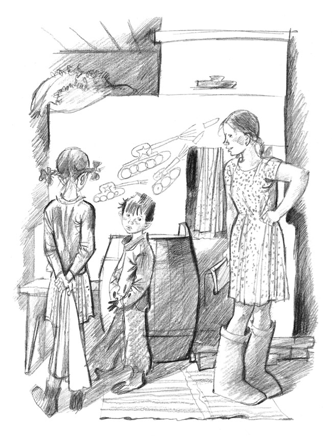 – Ну вылезай скорей! Я телёнку пойло приготовлю, а ты начисть картошки для супа и вымой… И где это Таиска запропастилась? Надо кур кормить, а её нет и нет! И печка нынче что-то не топится. Горе с вами!
