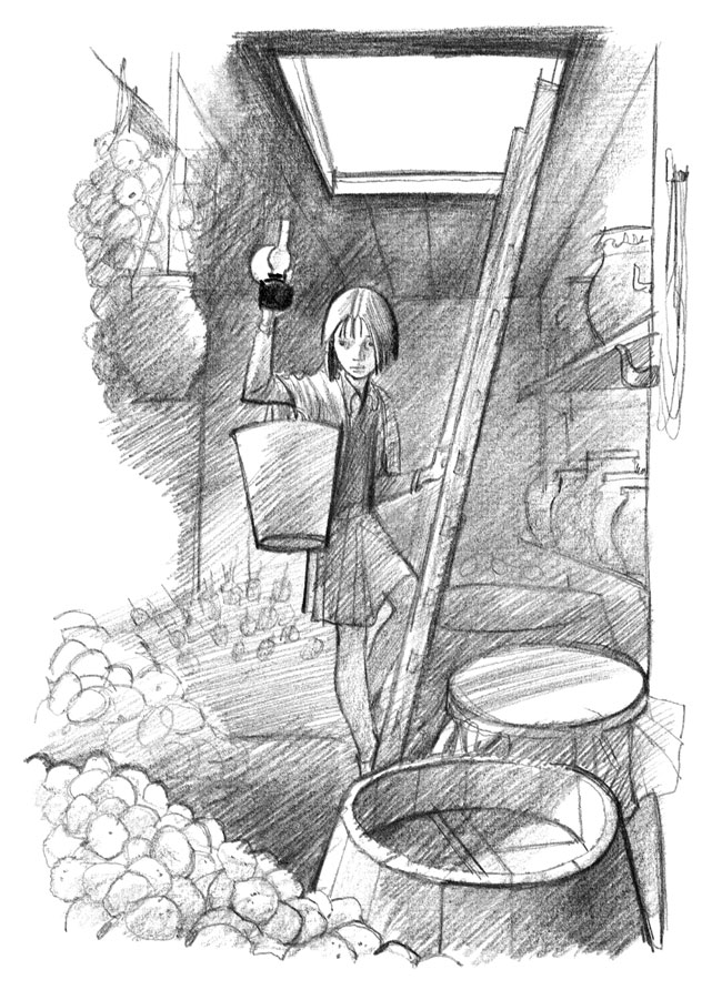 Валентинка зажгла маленькую синюю лампу, взяла бадейку и полезла в подпол. Свет лампы озарил земляные стены, кадки, покрытые деревянными кружками, кринки, яйца, уложенные в ящик и пересыпанные золой. Справа громоздился ворох картошки, круглой и крупной, как на подбор. Рядом красовалась жёлтая брюква. Из кучки песка торчали хвостики моркови… Оказалось, что в подполе совсем не страшно. Наоборот, интересно даже!