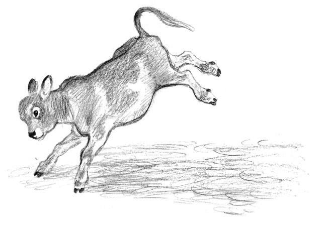 Но бычок и не собирался лезть обратно. Он принялся играть и бегать по тесному овчарнику. Овцы бросались от него, чуть не на стены прыгали. А ему это, как видно, очень нравилось: он фыркал, «ма́кал» и подпрыгивал на всех своих четырёх белых ногах.