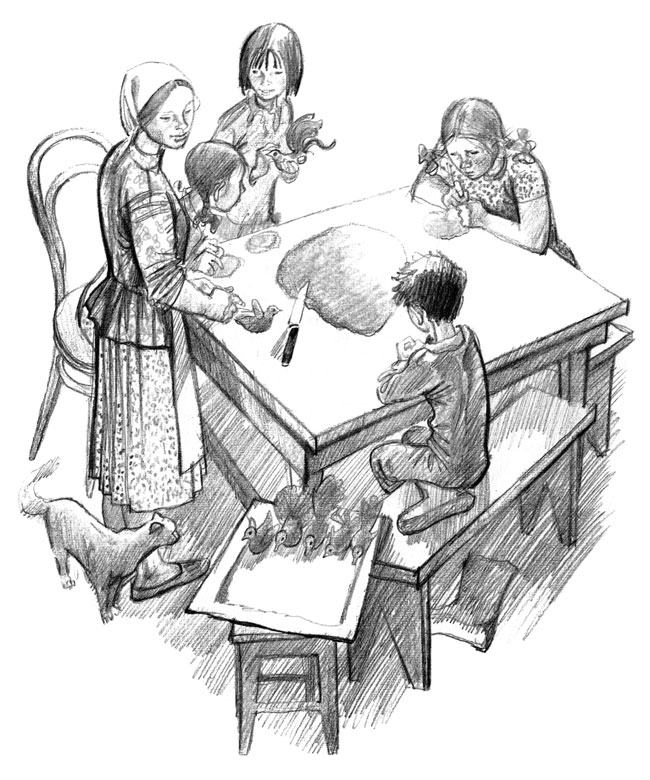 Валентинка побежала в избу. На кухонном столе пыжилось пухлое ржаное тесто. Ребятишки окружили стол. Даже ленивая Груша встала пораньше. Даже Романок проснулся, хотя завтрак ещё не был готов.