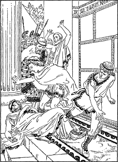Павсаний, бросив на пол окровавленный кинжал, убегал, расталкивая толпу.