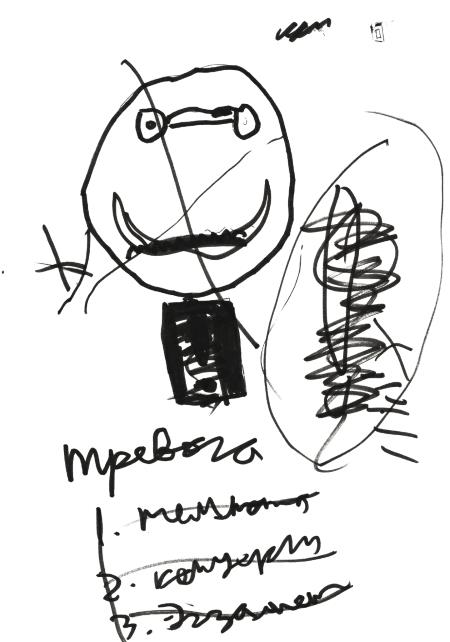 Комментируя свой первый рисунок, Денис объяснил, что больше всего ему страшно, когда он находится в темном помещении, когда должен выступать на концерте и перед экзаменом. Сначала он написал слово «тревога» под своим рисунком и указал, в каких именно ситуациях она у него проявляется. Потом он зачеркнул слова, вызывающие у него тревогу («темнота», «концерт», «экзамен»). После чего Денис зачеркнул своё изображение, объяснив это тем, что он не хочет быть таким.