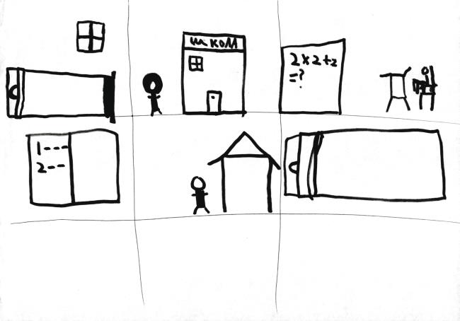 На следующей встрече я попросила Дениса нарисовать один день из своей жизни. Денис с удовольствием принялся за рисование, комментируя: «Я проснулся, пошел в школу, в школе сидел за партой и решал задачи, писал задания в тетради, потом вернулся домой и лег спать». Да… «интересная» жизнь у Дениса. Рисунок мальчика говорит больше, чем слова (см. рисунок 3).