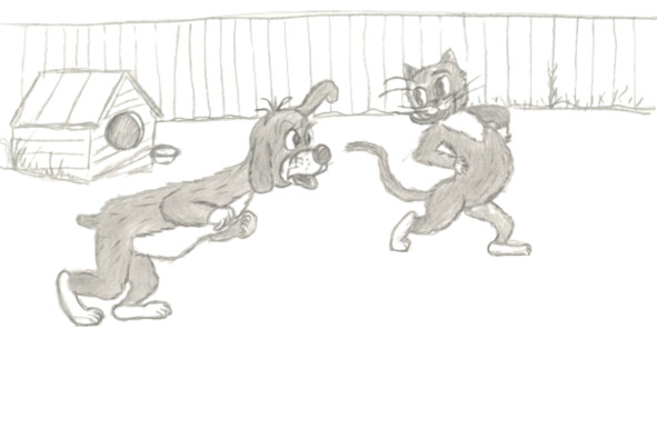 Смайк вдохнул по больше воздуха и подбежал к собакам. Он начал громко мурррлыкать, это услышала даже Блэки, которая сидела высоко высоко на дереве. Потом она посмотрела и сказала