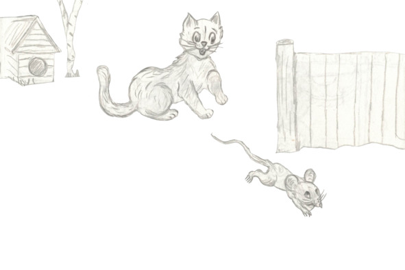 Я быстро пробежал около сарая. Мышку я видел до сих пор. Потом она побежала к цветам, ну а я за ней. Вдруг Ира увидела эту происходящую картину. Она быстро среагировала и подбежала к нам. Я думал, что она мне поможет, а оказывается, бабушка придержала меня, а мышка убежала. По началу я на неё рассердился, и начал нервно дрыгать хвостом. Я думал, зачем ты меня задержала? Вообще-то я голодный, и хотел бы пообедать!!!