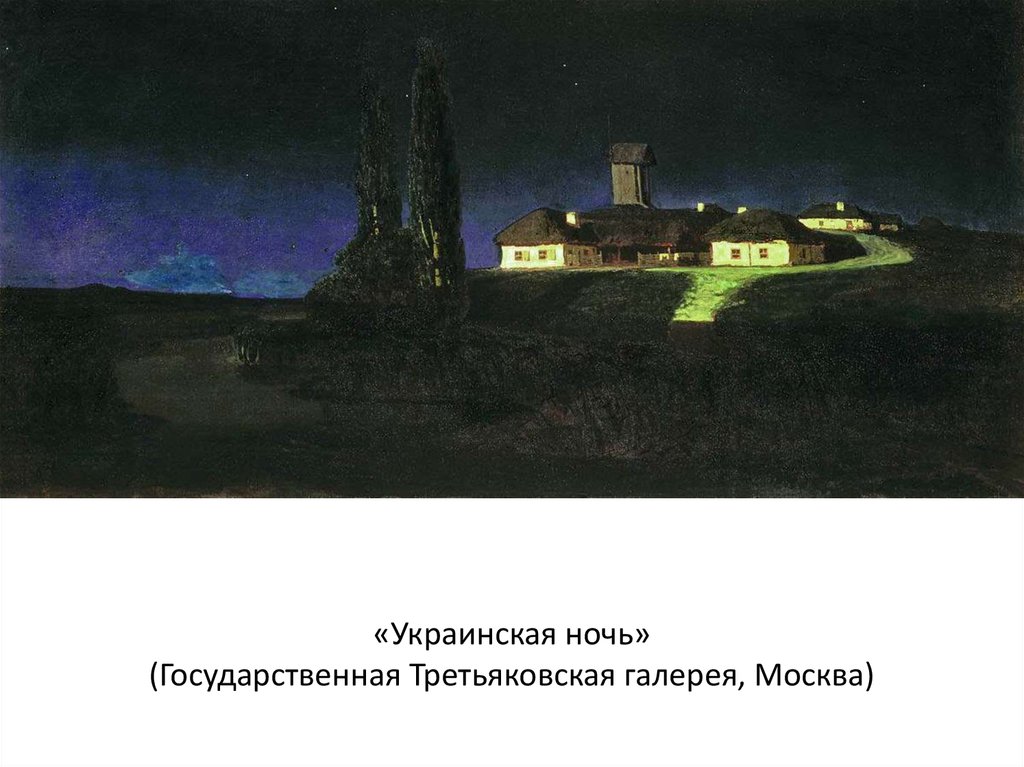 «Украинская ночь» вызвала всеобщее восхищение у публики, необычно почти фантастически изображённым пейзажем. Этой работой ознаменовался активными творческими поисками. Главным выразительным средством стала глубина охвата пространства даже за счёт уплощения предметов и в этом новый поиск изобразительных средств путем некоторой декоративности в смысловой ценности произведения. Художник разработал и применил яркий цвет, основанный на гамме цветов, дополняющих детали полотна. В русском изобразительном искусстве это стало новаторством – ранее подобные средства применялись очень редко и достаточно интуитивно.