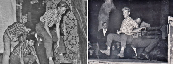 Иногда жизнь сама подбрасывала нам элементы, которые в дальнейшем попадали в танец. Однажды мы выступали прямо в правлении какого-то совхоза сразу после его собрания. У одной стены комнаты сидели зрители на лавках, у противоположной выплясывала Корова, т. е. мы с Женей. Места было мало, и в какой-то момент Женя прижал меня к стенке, возле которой стояло несколько ящиков. Мне ничего не оставалось делать, как сесть на эти ящики и болтать ногами. Оживление в зале было необыкновенное. Естественно, мы включили эту находку в дальнейшие наши выступления.