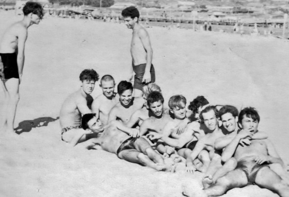1959.07. Подмосковье. Берег Оки. Стоят: Игорь Коган, Феликс Ерешко. Сидят: Игорь Борисов, Николай Преображенский, Михаил Балашов, Михаил Размахнин, Рустэм Любовский, Вадим Авраменко, Валерий Рау, Анатолий Кузнецов, Лев Хямяляйнен, Иосиф Рабинович, лежит Андрей Фрейдин
