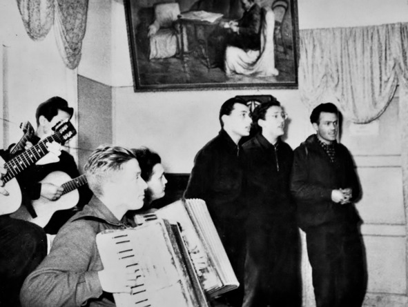 1959.07. Подмосковье. Концерт начинается выступлением хора: Александр Кузнецов (баян), Рустэм Любовский, Наталия Козлова, Галина Волошина, Светлана Солодченкова, Валерий Цой, Анатолий Фельдман, Лев Хямяляйнен, Михаил Балашов, Тамара Константинова, Андрей Фрейдин, Михаил Размахнин