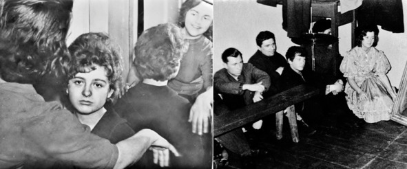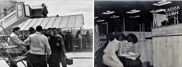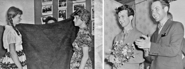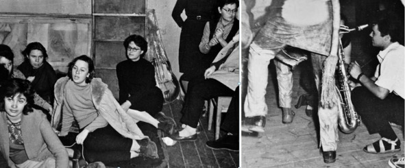 1962.02.Слева – после падения в оркестровую яму: Неля Фастовец, Алла Павлова. Справа – клуб небольшой, ждём своего выступления тут же, на сцене