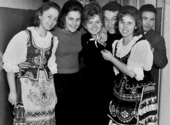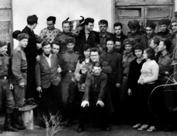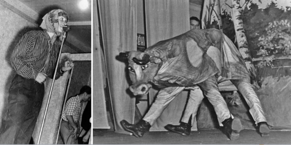 1962.02. Среди студентов Павлодарского института после концерта. Справа – дойка Коровы в процессе выступления: Жора Иванов