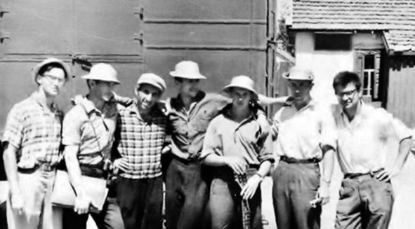 1963.07. Калмыкия, Элиста. Великолепная семёрка: Рустэм Любовский, Валерий Ириков, личный шофёр агитбригады, Михаил Николаев, Стас Зимин, Геннадий Яковенко, Марат Кузьменко