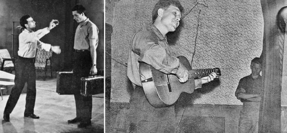 1964.07. Душанбе. ТВ. Сценка о работе ТВ про «рояль в кустах»: Игорь Коган, Миша Фёдоров. Справа – мир тесен: Памир. Погранзастава в районе Мургаба. На сцене Саша Яковлев, за кулисой – Миша Размахнин