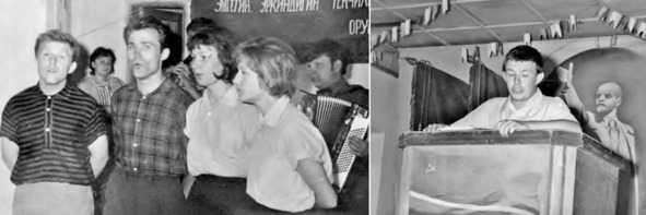 1965.07. Квартет «2+2»: А. Яковлев, Ян Малашко, М. Вышинская, Н. Белёнова. Справа – Леонид Вышинский с лекцией о кибернетике и вычислительных машинах. По поводу этой фотографии кто-то острил: «Верным путём идёте, товарищи!»