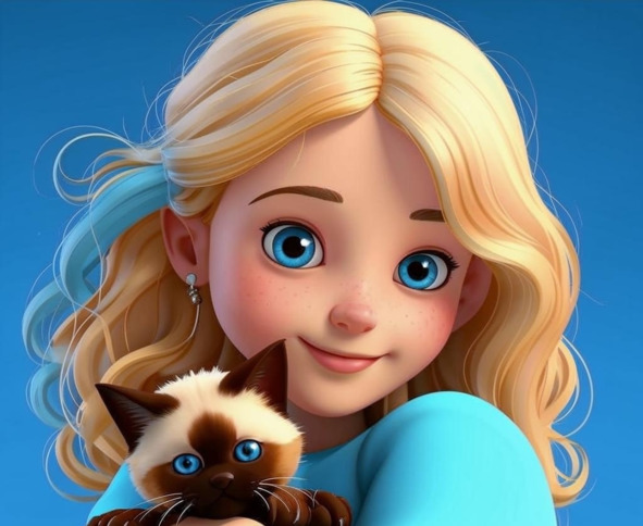 У девочки были большие голубые глаза, как у самой кошечки. Ещё у неё был миленький носик, торчащие ушки и два хвостика-косички.