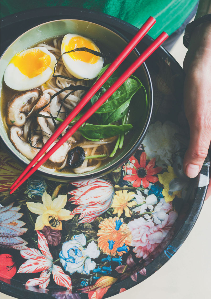 Place the noodles, spinach and the egg halves into a bowl, and pour over the stock and mushrooms. Garnish with nori ribbons to serve.