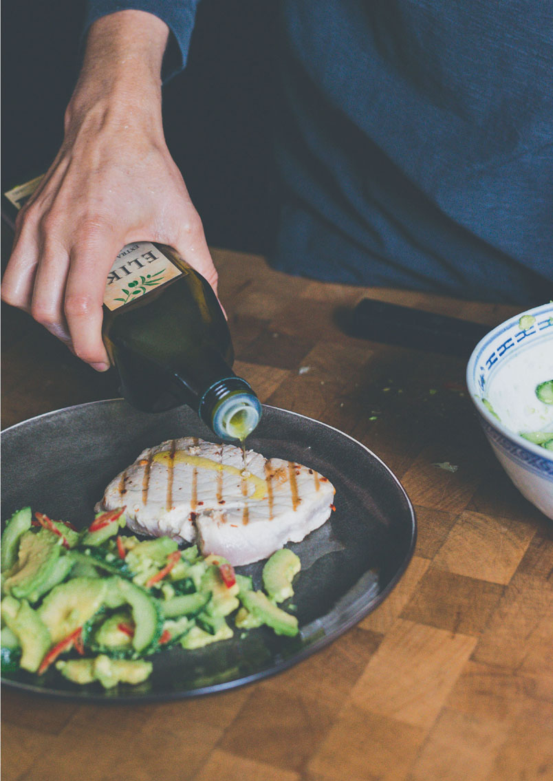 Combine the juice of half the lime, the olive oil, the salt and chilli flakes, and marinate the tuna in this mix for 10 minutes.