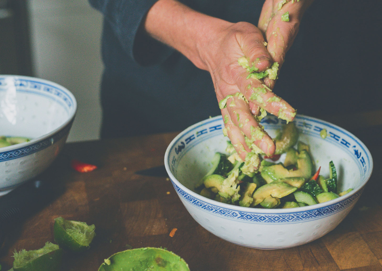 Meanwhile, make the salad. Halve the cucumber lengthways and pull a teaspoon down the middle to scoop out and remove the seeds. Cut the cucumber into thin slices and place them in a bowl. Add the chilli rings, ginger and avocado. Sprinkle with the remaining lime juice to taste. The salad should be quite hot and sour. Lastly, add a tiny bit of soy sauce (around a teaspoon) and a pinch of salt.