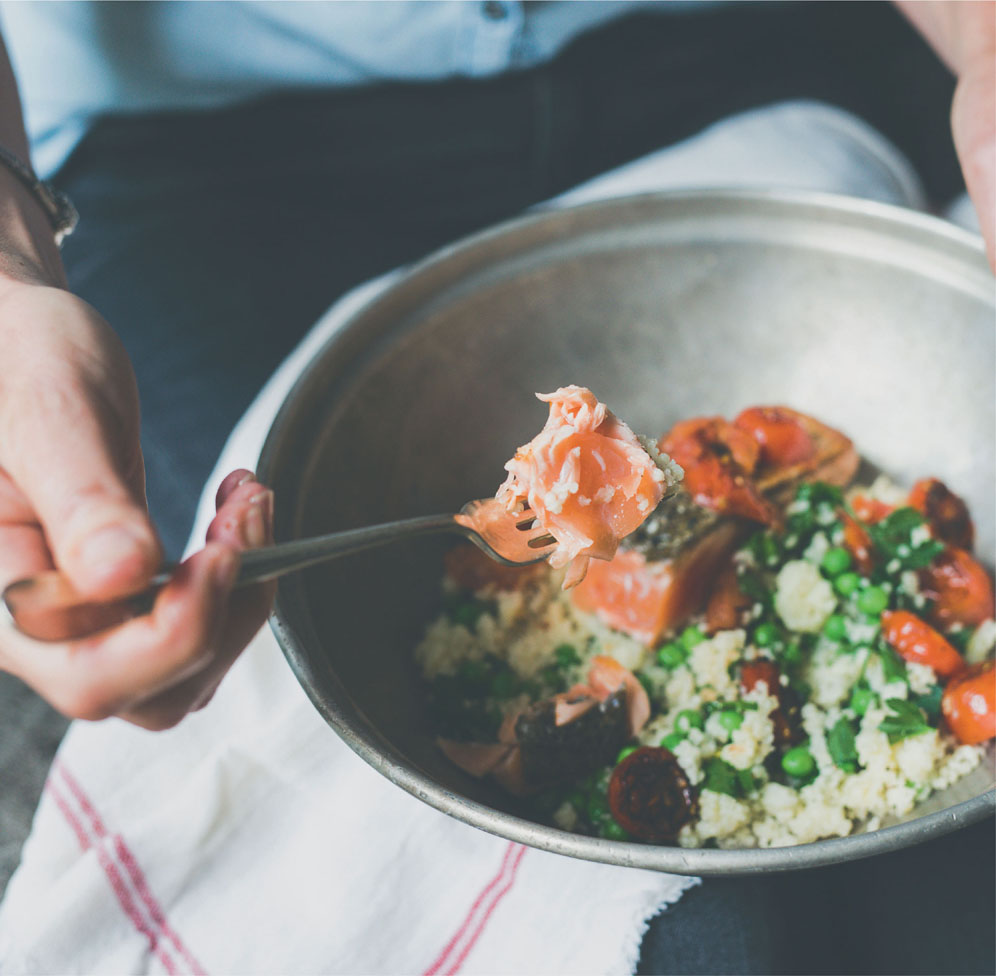 When the couscous is ready, fluff it up with a fork then stir in the parsley and taste to see if it needs more lemon or salt. Turn it out on to a plate, place the salmon alongside and spoon over the softened tomatoes.