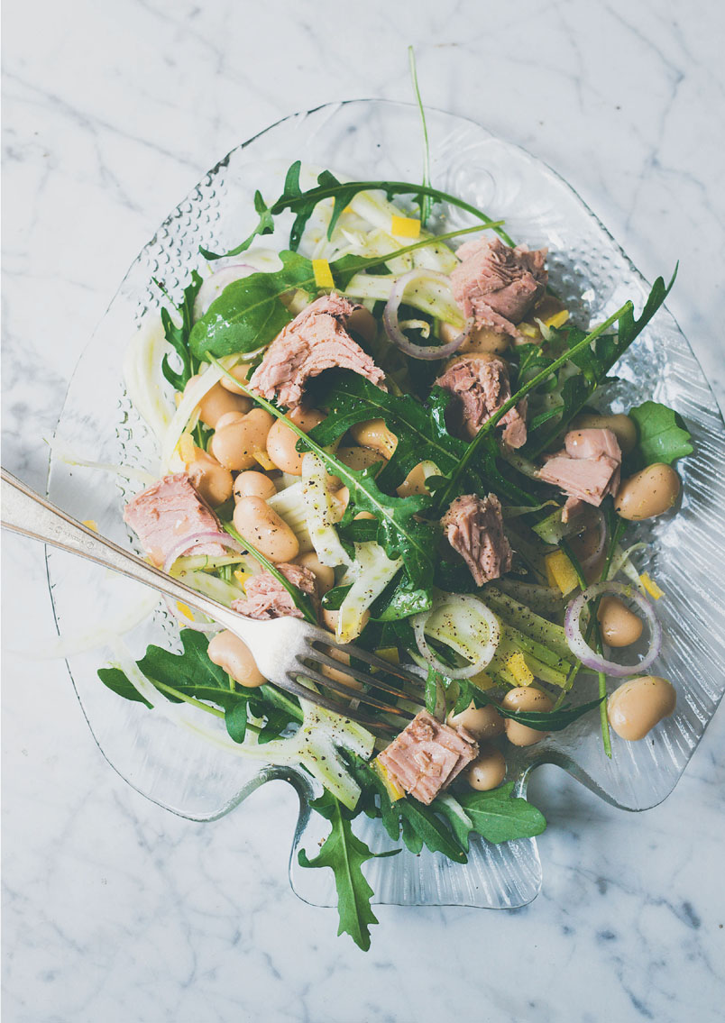 Mix together the beans, fennel, shallots, rocket, mint and capers or preserved lemon peel, and dress the mixture with lemon juice, a splash of olive oil, salt and freshly ground pepper. Drain the tuna and flake it over the salad in large chunks.