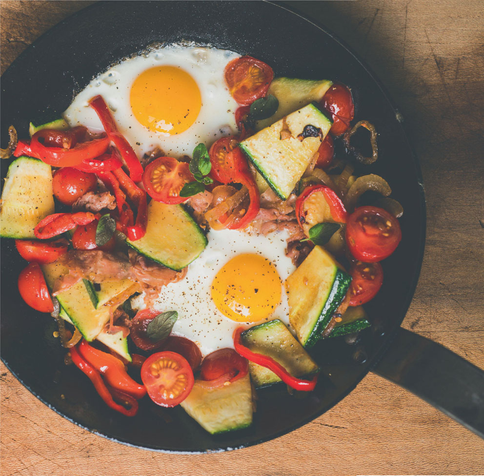 Make two depressions in the vegetable mixture and break in the eggs, then cook for 2–3 minutes until the eggs are set, covering the pan for the last 30 seconds. Sprinkle over a little more salt, if necessary, and in any case with a generous amount of freshly ground pepper and finish with basil or flat-leaf parsley.
