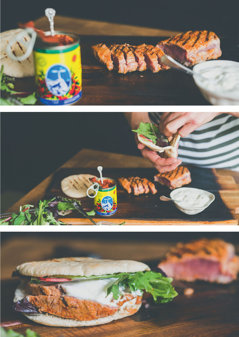 Cut the rested meat into thin slices. Slice open the pittas and fill them with hummus, meat, lettuce and a dollop of the garlicky yoghurt.