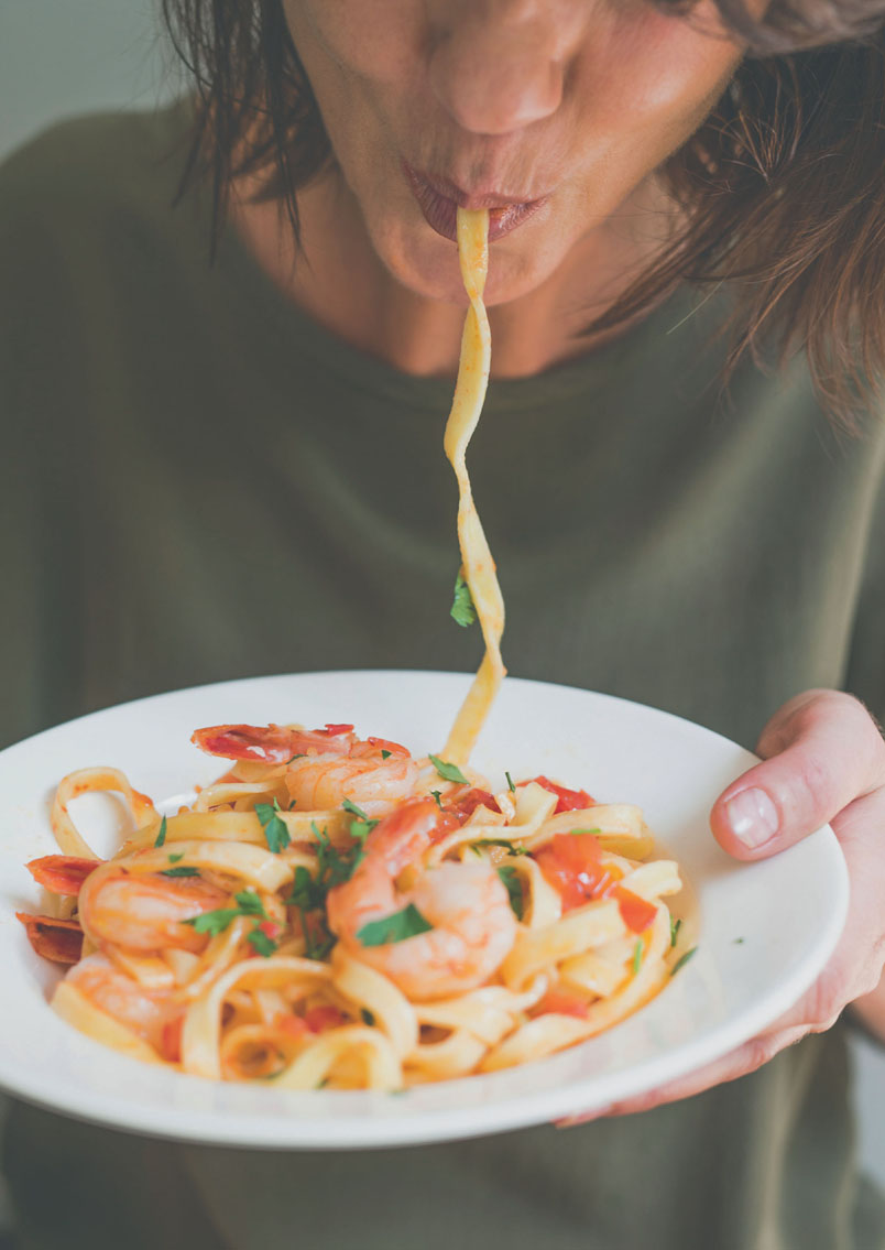Tagliatelle with prawns & smoky whisky–tomato sauce