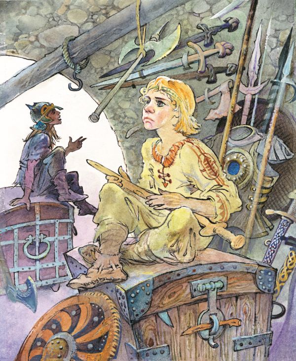 Теперь Харальд и Кукша спят рядом, едят вместе и подолгу где-нибудь пропадают вдвоём. Особенно любят они забираться в огромную сумрачную оружейную. Все стены её увешаны оружием и доспехами. В потолочные балки, как и в стены, вбиты кованые крюки и гвозди, на них висят панцири, кольчуги и шлемы.