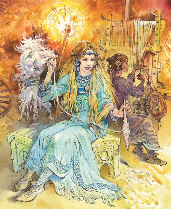 Хотя девушки – конунговы дочери, они много работают: сидят за прялкой или ткут на кроснах[10] льняные и шерстяные ткани. Сёстры очень весёлые и часто рассказывают смешные истории или затевают шутливую перебранку. Но поздно вечером, когда вся усадьба засыпает, здесь звучат страшные рассказы и сказки. Девушки к этому времени перестают работать, вооружаются старыми тупыми ножами и начинают искать друг у друга в голове.