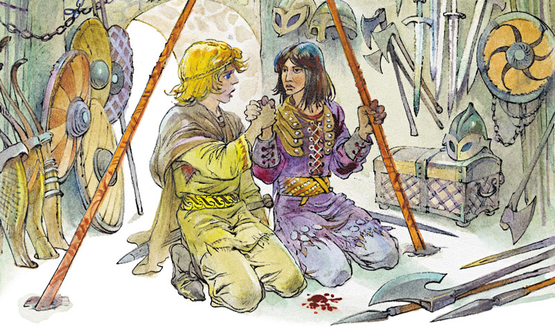 Харальд больше не в силах терпеть, он сгорает от любопытства. Едва они выходят из оружейной и прикладывают к порезам снег, чтобы унять кровь, как он объявляет с торжеством в голосе, что теперь-то уж Кукша ему расскажет, что у него за нужда непременно отправиться в поход с викингами, они побратимы и не должны ничего скрывать друг от друга!