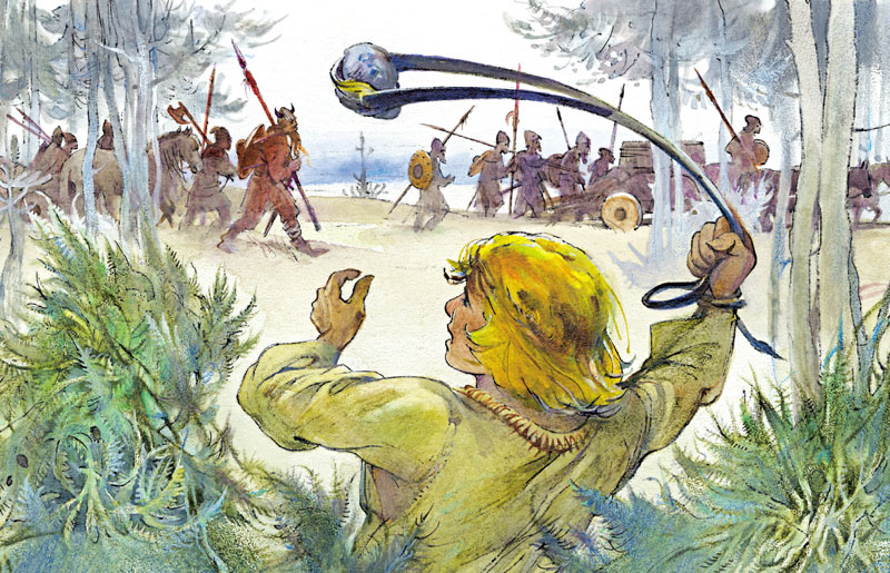 Побежал я в бор и притаился среди можжевёловых кустов близ тропки, по которой пойдут варяги. Размотал пращу, камень в неё заложил, жду. На поясе мешок висит, в нём запасные камни.
