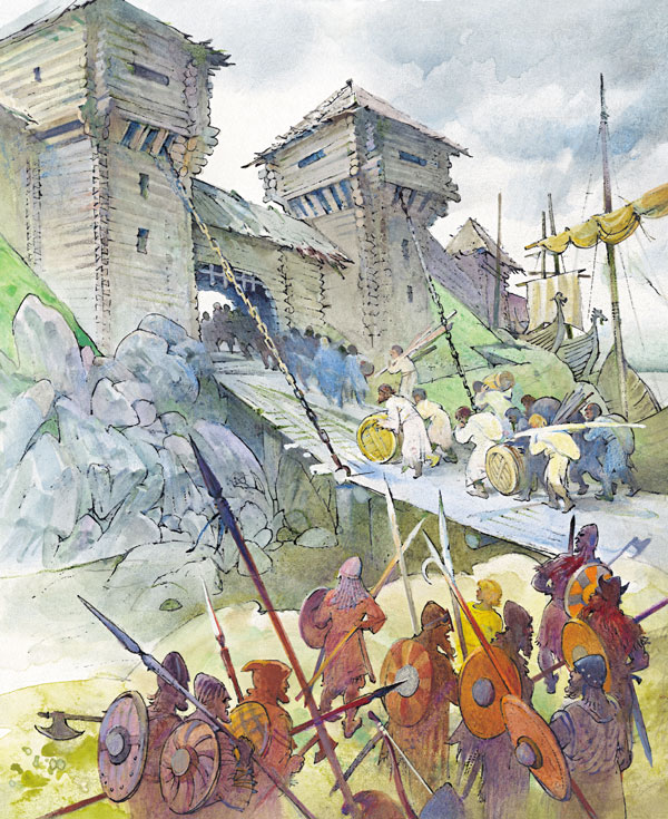 По берегам Волхова лес не тянется сплошной стеной, как у нас, больше поля да деревни. Недолго мы там плыли, глядь – за поворотом детинец: крутой земляной вал, на нём бревенчатые стены и башни. Кругом домики. Тюр говорит: