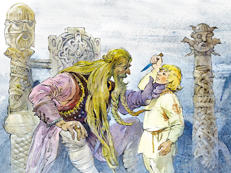 Я боюсь смотреть на князя, а не смотреть не могу. Князь – настоящий великан, глазищи, как сковороды, ручищи, как лопаты. Волосы светлые, длинные, чуть не до колен, борода в две косички заплетена, торчат те косички вперёд, точно раздвоенное змеиное жало. На шее у князя золотая гривна, на ней молоточки нанизаны. Сиденье княжеское двумя столбами резными украшено, на каждом по идолу, один молот к груди прижимает, другой так стоит. Теперь-то я знаю, что это варяжские боги Тор и Один, а тогда не знал.