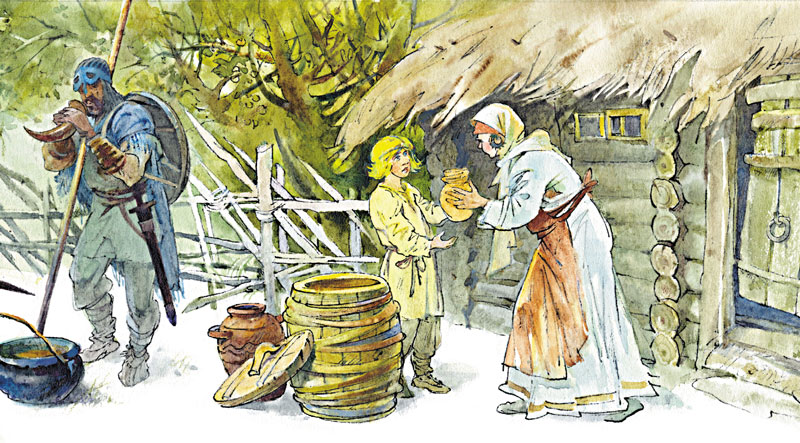 Варяги пришли сюда мёду купить. Продала она им, сколько просили, и стала угощать: наливает ковш из жбана и подаёт каждому по очереди. И со всеми заговаривает по-нашему, у одного спрашивает, хорош ли мёд, у другого – далеко ли путь держите. Никто, конечно, её не понимает. Догадался я, что это она нарочно, проверяет, не разумеет ли кто из варягов наш язык.