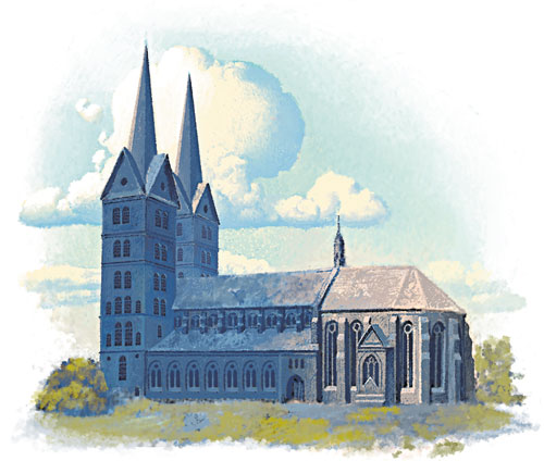 Пройдя ещё немного, Мартин оказался на перекрёстке, с которого был хорошо виден Домский собор. Стоял он на большом холме, и холм этот назывался Домской горой. Собор был огромен и великолепен; два его высоких стройных шпиля были словно из кружева. А издалека эти шпили казались иглами, вонзёнными в небо. В городе Юрьеве не было ничего выше их.