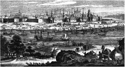 Я гляжу в окно – под нами уже близко голая степь. Река, шириною с море, катит свои воды в другое море – совсем уж бескрайнее. Горизонт его блещет на солнце, устье распадается на множество рукавов. Вдалеке лепятся друг к другу, сходятся и расходятся виноградники, засеянные поля, огромные сады, многочисленные хозяйственные постройки, верфи, лесопильни. Вот показалась и каменная гавань, густой лес корабельных мачт.