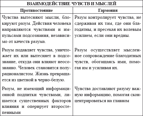 У кого-то может сложиться впечатление, что мы за разум и против чувств. О нет! Чувства и разум даны человеку как инструмент познания и средство внутренней мотивации. Палитра чувств насыщает жизнь красками, свет разума делает ее целесообразной, придает смысл. Таким образом, полнота жизни обеспечивается совместными усилиями чувств и разума. Но они должны быть в гармонии. Чувства и мысли могут противостоять друг другу или быть в гармонии. Взаимодействие чувств и мыслей представлено в таблице 1.2.1.
