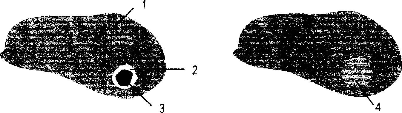 Рис. 5. Пораженный орган: 1 – орган; 2 – опухоль; 3 – поврежденный опухолью тонкий слой ткани; 4 – фиброз после распада опухоли и тонкого слоя ткани, прилегающей к опухоли.