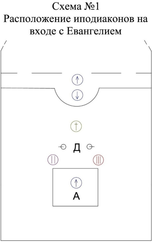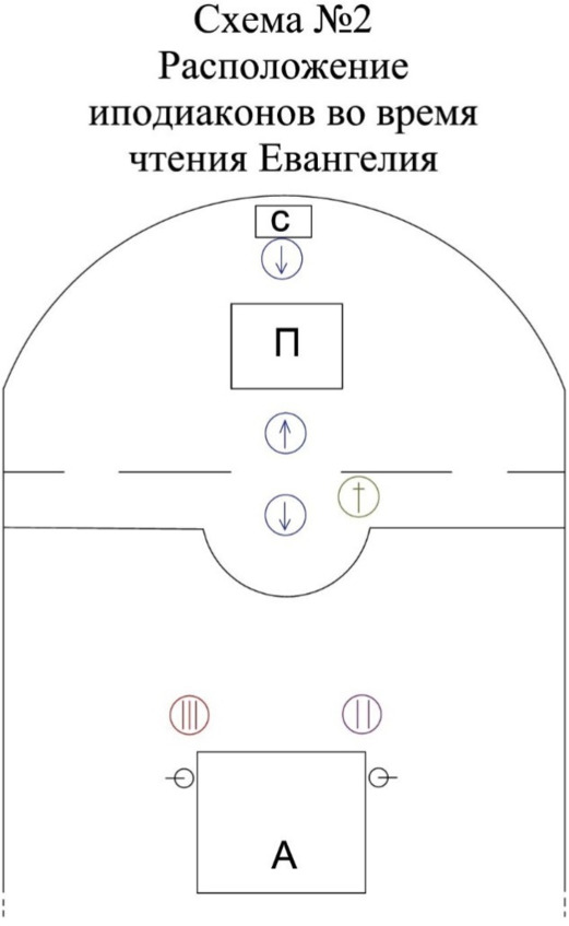 В это время иподиаконы стоят у «кафедры» в порядке, указанном на Схеме №2.