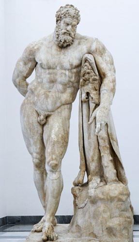 Огромная мощная статуя (ил. 7), некогда украшавшая великолепные императорские термы в Риме, иллюстрирует уставшего Геракла, тяжело опирающегося на свою неизменную палицу, на которую он накинул львиную шкуру. Римляне восхищались греческой культурой и копировали наиболее прославленные произведения. Греческие скульптуры обычно отливались из бронзы и практически утрачены. Римские копии чаще всего изготавливались из мрамора и сохранились лучше. Оригинальная модель для этой статуи была, вероятно, выполнена из бронзы знаменитым скульптором Лисиппом в VI веке до н. э. Герой-атлет изваян с глубоким сочувствием и предстает просто утомленным бесконечными поручениями человеком. В правой руке, спрятанной за спиной, Геракл держит добытые золотые яблоки Гесперид. Это было последнее из длинной череды изнуряющих заданий, возложенных на героя, и о том, каких усилий оно ему стоило, мы можем судить по его изможденному виду.