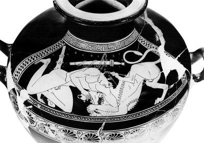 В VI–V веках до н. э. наиболее востребованными были два типа изображений этого момента: на одном сцепившиеся Геракл и лев почти распластаны на земле (ил. 13), на другом оба стоят (ил. 14).