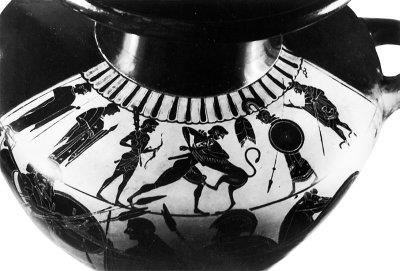 Ослепление Полифема было популярной темой с давних времен; первые изображения появились еще в VII веке до н. э. Этот сюжет легко идентифицировать даже на фрагменте вазы (ил. 17), где видно, как двое мужчин втыкают жердь в глаз полулежащего великана. Судя по сохранившейся части ноги третьего мужчины в правом углу, первоначально фигур было больше.