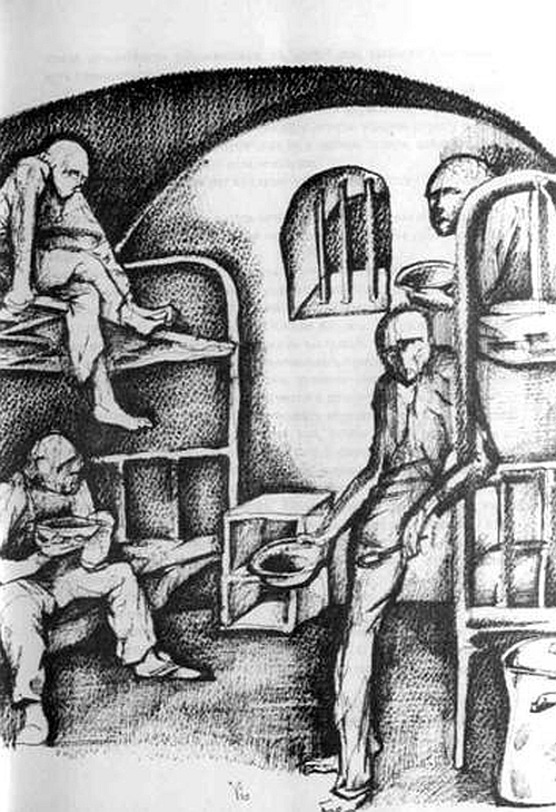 В круглой, немного конической башенной камере сидит мрачный скуластый уголовник с маленькими зоркими черными глазками под едва заметными выцветшими бровями. Он криво усмехается. Физиономия большая, круглая, волевая, собранная. Напряженный прищур глазок, глубоко посаженных под выпуклым лбом. Камера от пола до уровня головы окрашена тем же зловещим цветом, что и двери. Окошко тоже круглое, низкое. Знакомимся. Его фамилия Малышев, он преступник-универсал, ничем не брезгует.