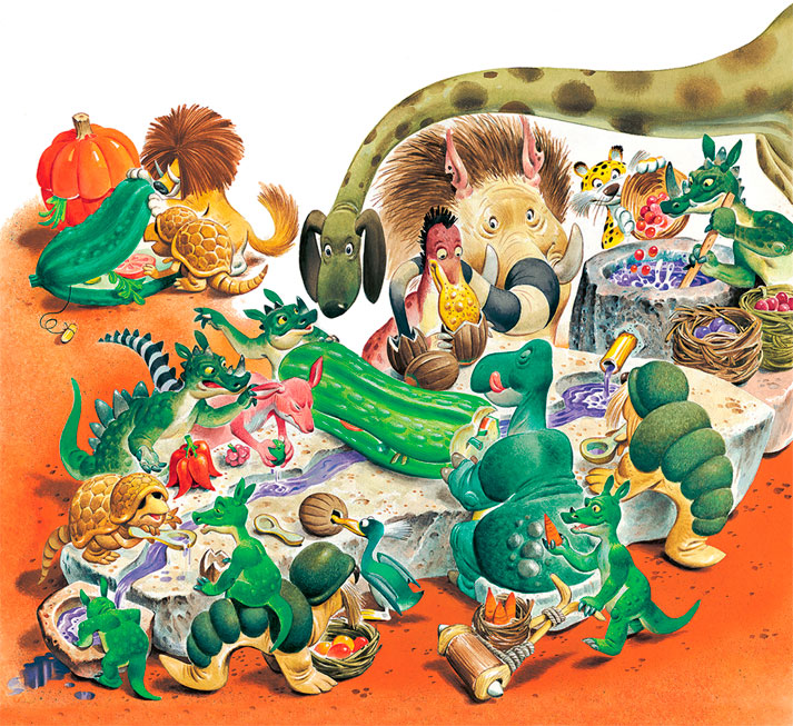 «Обед готов! Пожалуйте к столу!» – звали всех хозяйки-дракозаврихи. Правда, стол нельзя было назвать столом. Это был скорее обломок скалы, гладкий с одной стороны.