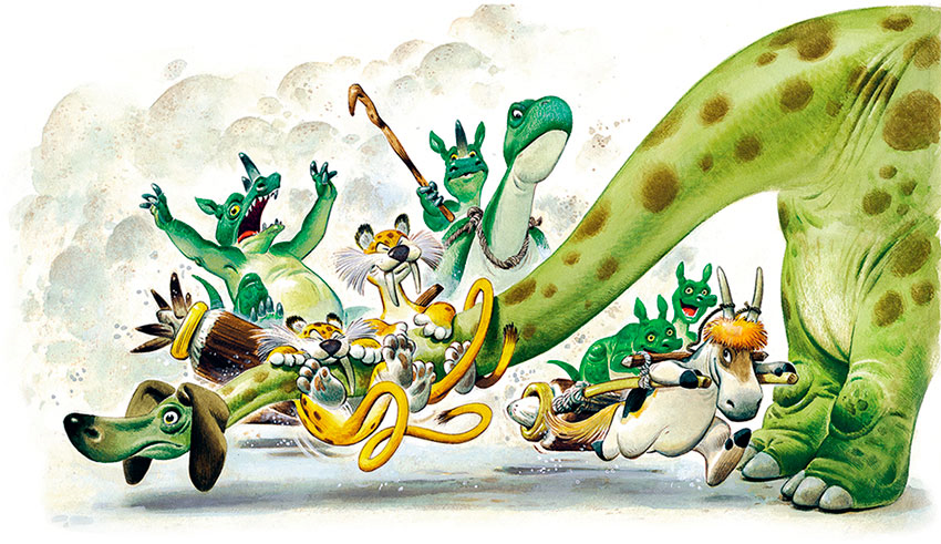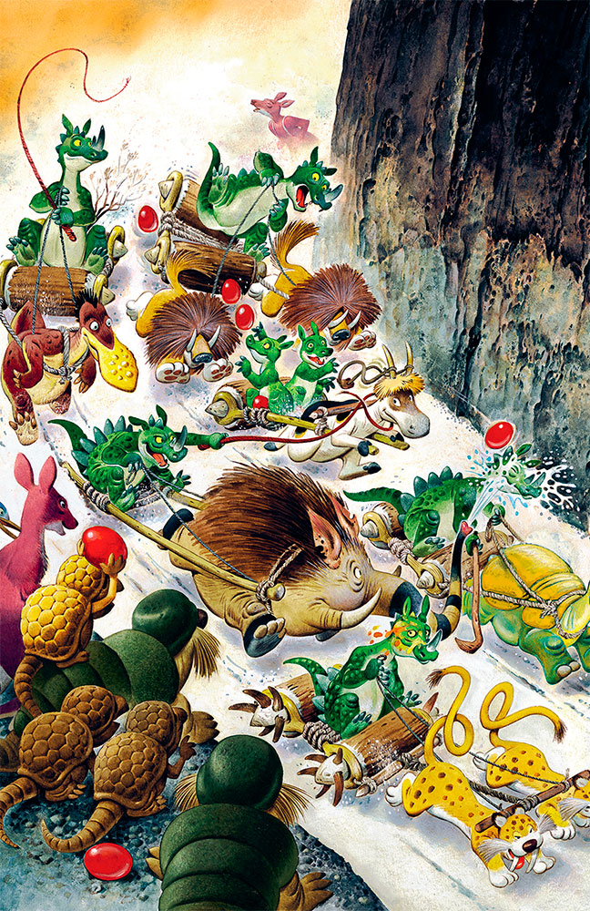 Кроме Рогатого, в повозки впряглись Бронезавр, Хохолок и толстяк Хоботок. А пятнистые Саблезубы и гривастые Клыкарисы договорились бежать парами.