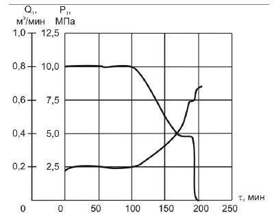 Прием воды начинался только при давлении 2,5 МПа, так как в момент испытаний над горизонтом нагнетания воды был статический столб подземных вод, равный 200–220 м.