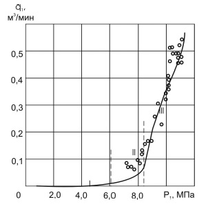 Здесь представлены параметры процесса нагнетания воды через одну из скважин в угольный пласт «VI Внутренний», имеющий на глубине 240 м мощность 1,8 м и газопроницаемость 4–5 мД. С увеличением количества воды, нагнетаемой в скважину, росло давление нагнетания. Однако характер этой зависимости был различным по участкам графика. Можно выделить три характерных участка.