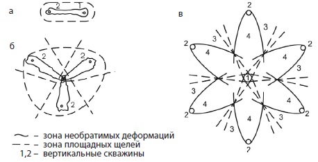 На рис. 8 (в) представлена принципиальная схема участка угольного пласта с пробуренными семью скважинами. Количество скважин на периферии может быть снижено до трех, соответственно, с меньшей зоной разупрочнения (рис. 8 (б)).
